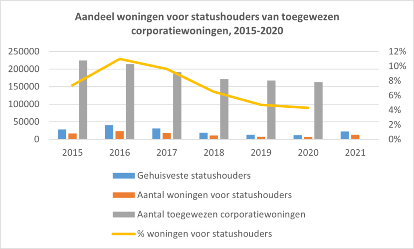 Relateren we het aantal woningen dat beschikbaar is gesteld aan statushouders aan het totaal aantal toegewezen sociale huurwoningen dan blijkt dat in de periode 2015-2020 jaarlijks gemiddeld 7,3% van alle sociale huurwoningen van corporaties verhuurd werd aan statushouders. Er was een piek in dat aandeel van 11% in 2016 (het gevolg van de ‘migratiecrisis’ van 2015). Daarna nam het aandeel ieder jaar af tot 4,3% in 2020. Er is nog geen informatie beschikbaar over het totaal aantal toegewezen sociale huurwoningen in 2021. Dat aantal ligt vermoedelijk niet (veel) hoger dan in 2020. Als dat aantal gelijk is gebleven, dan werd in 2021 4,5% van alle sociale huurwoningen van corporaties verhuurd aan statushouders.