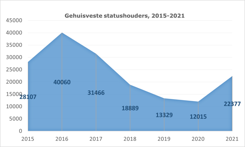 Hoeveel van die toegewezen sociale huurwoningen gaan er naar statushouders? Van het COA hebben we data ontvangen over hoeveel statushouders de Nederlandse gemeenten de laatste jaren hebben gehuisvest. Daaruit blijkt dat de verhoogde aantallen asielzoekers tijdens de ‘migratiecrisis’ van 2015 ook tot een piek hebben geleid in het aantal statushouders dat is gehuisvest: ruim 40.000 in 2016. Dat aantal is sindsdien jaarlijks gedaald tot en met 2020. In 2021 is het aantal gehuisveste statushouders voor het eerst sinds 2015 gestegen ten opzichte van het jaar ervoor. In 2021 hebben alle Nederlandse gemeenten samen 22.377 statushouders gehuisvest (peildatum 1 januari 2022). Over de periode 2015-2021 hebben de gemeenten in totaal 166.243 statushouders gehuisvest. Gemiddeld huisvestten zij in deze periode 23.749 statushouders per jaar.